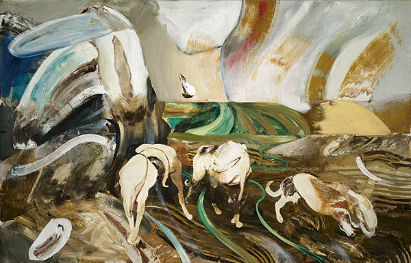 In Hunting Scene, there are three hunting dogs not quite figurative and not quite abstract. My interpretation for the rest of the painting is the brown in the foreground earth, the blue to the left water and in the background the green is pasture and the grey dull skies. These panels of colour hold together and without being figurative in anyway give you a painting that shows a landscape with three hunting dogs.