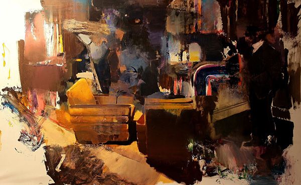 Adrian Ghenie a Romanian artist born in 1977 works with large canvases but not painting with a brush, instead he uses a lot of other tools as instruments to lay down his paint. He references artists as well as the tools to apply his painting.