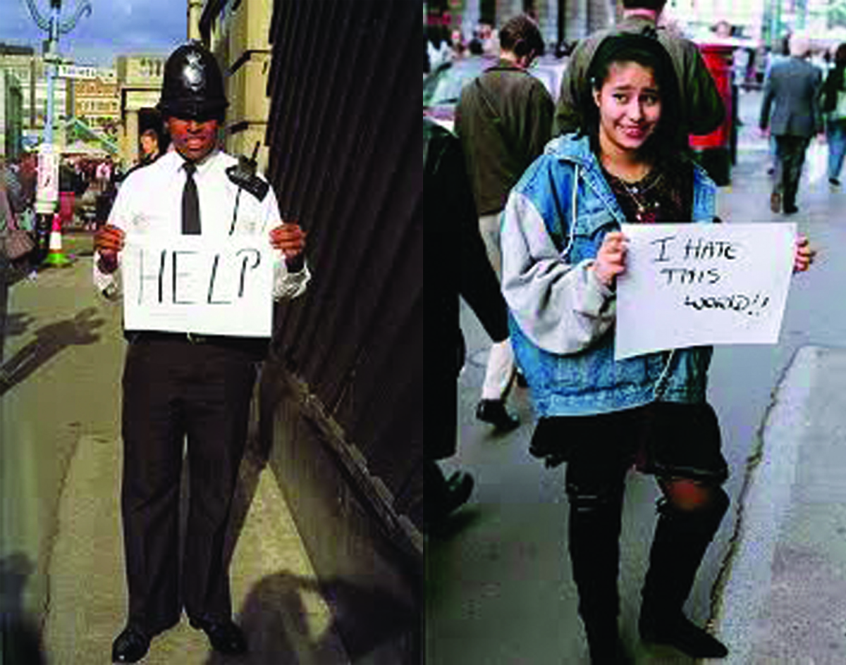 The policeman is holding up a sign that says 'HELP' is he saying he needs help in his everyday life, is he unsure of what to say so says 'help' as in help me think of something to say. Is he thinking that his job as a policeman is just too much and that he needs more help. These are just a few of the interpretations, and that is what is so good about this project is that some people will really put their heart on their sleeve and say exactly what they are thinking and will write down their inner most thoughts.