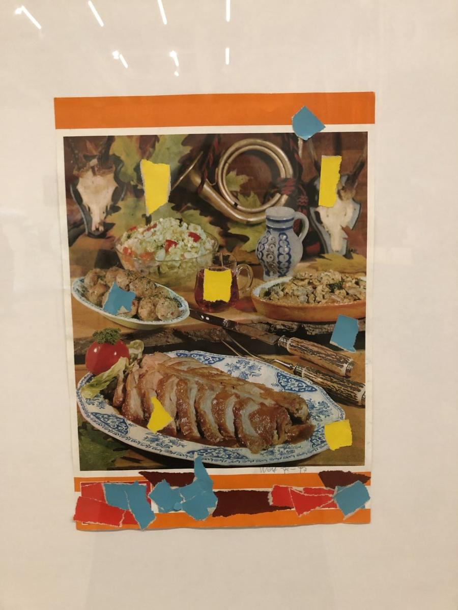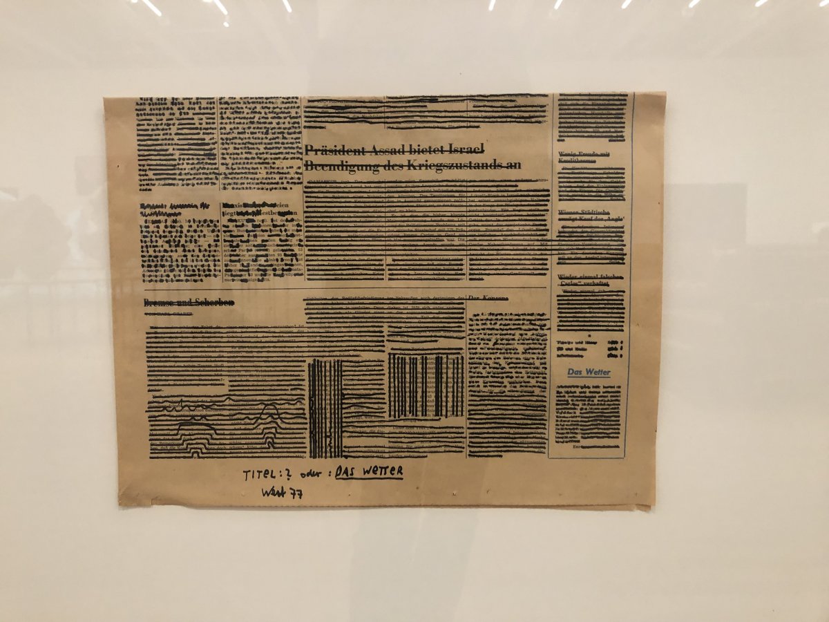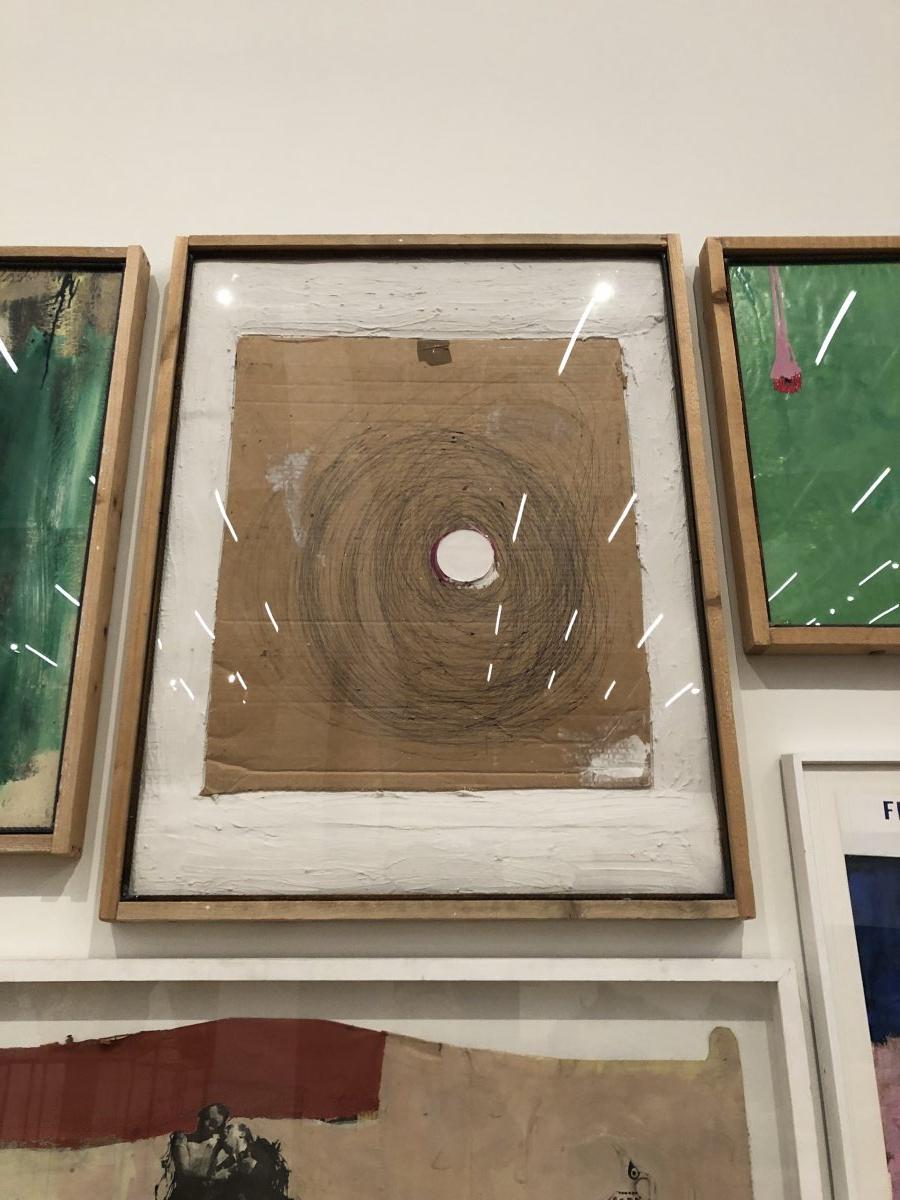 Franz West used a lot of mediums and a lot of his hanging work at the exhibition was made up from the most simplistic materials. A piece of cardboard with a hole cut out was spiralled with pen. A sheet from a newspaper with horizontal and vertical lines over the text and few squiggles also. A picture with torn coloured paper added.