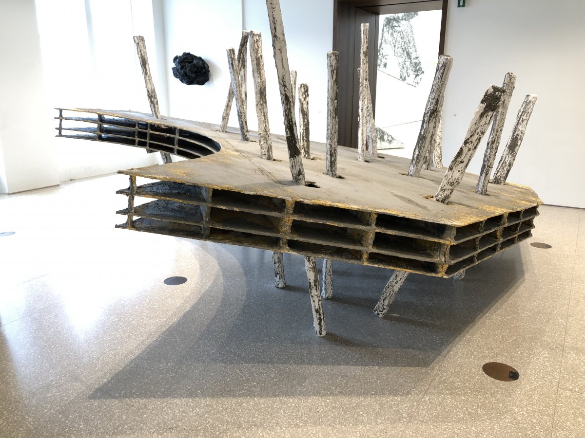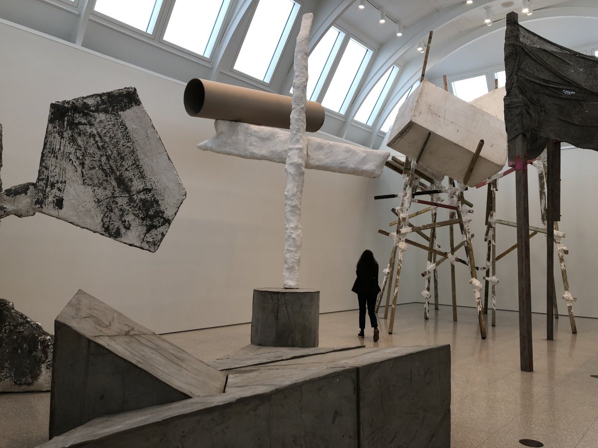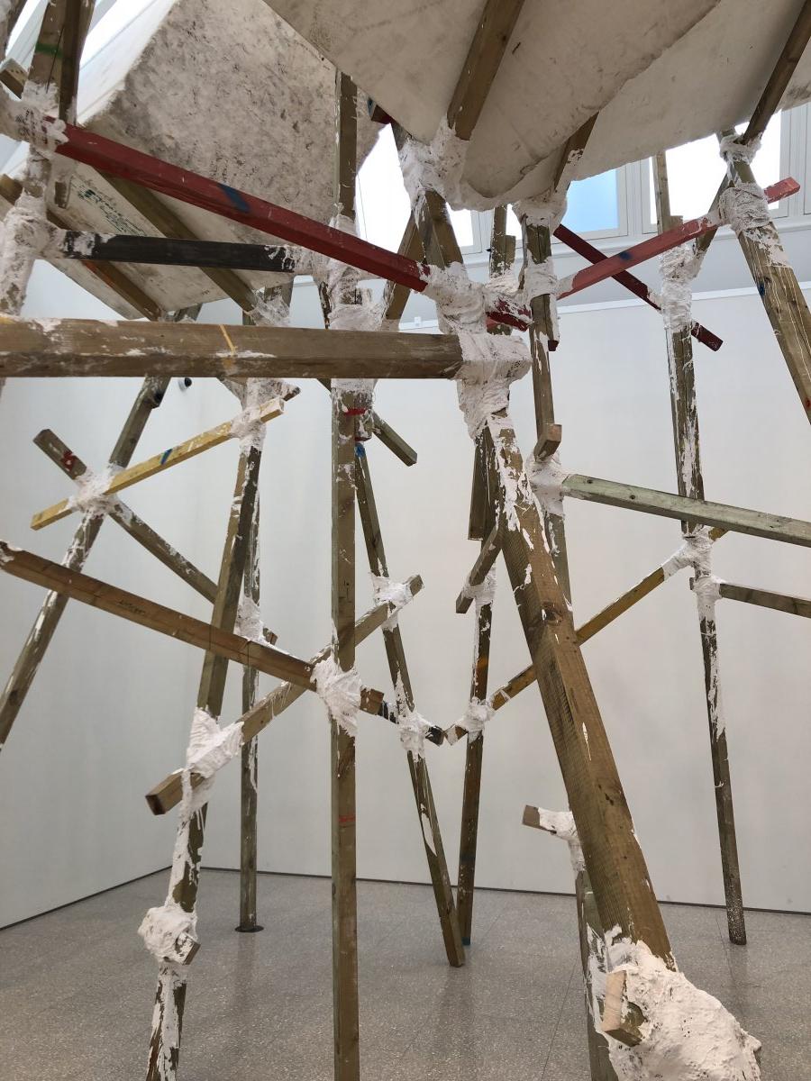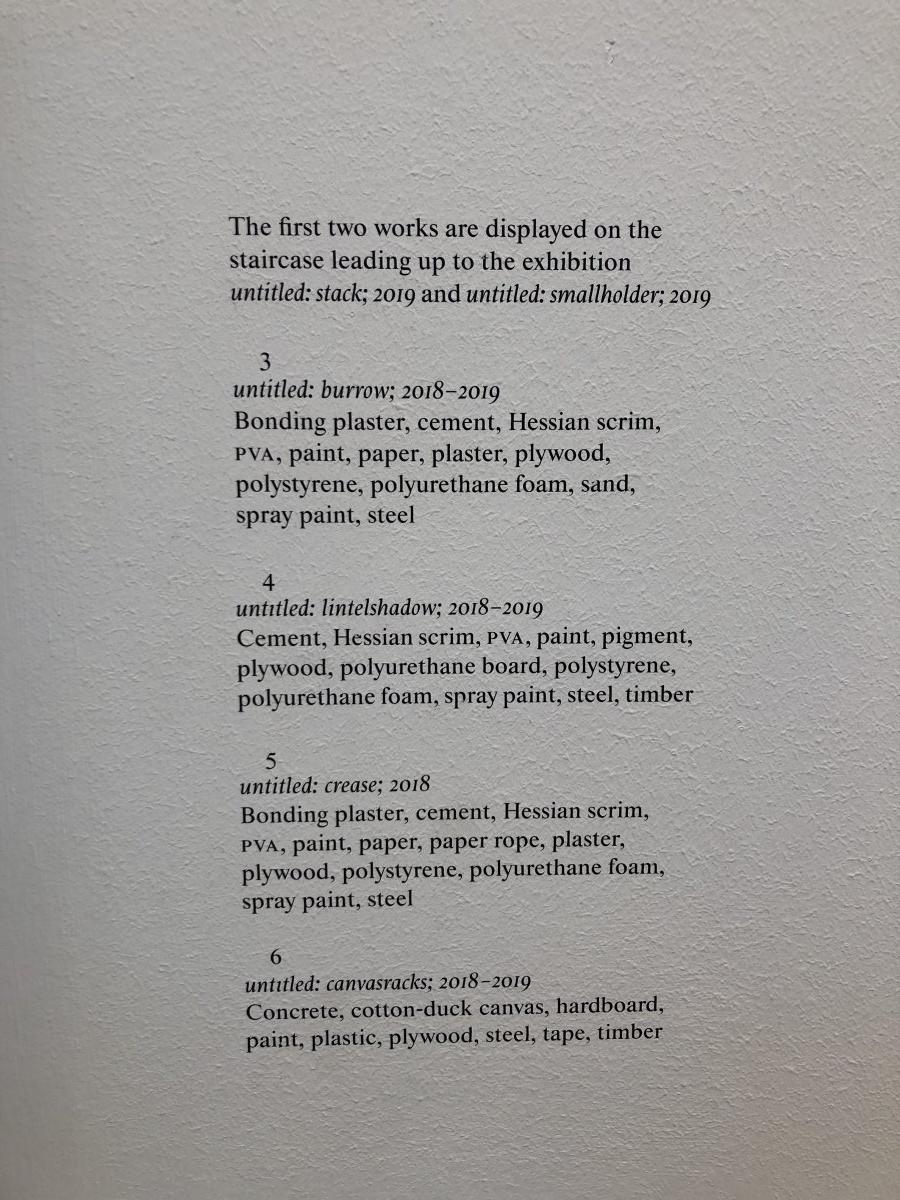 The materials used in this exhibition are all quite industrial- plaster, timber, foam, hardboard, polystyrene, hessian, concrete. These materials allowed Barlow to manipulate and change what she had put together, more freedom to experiment.