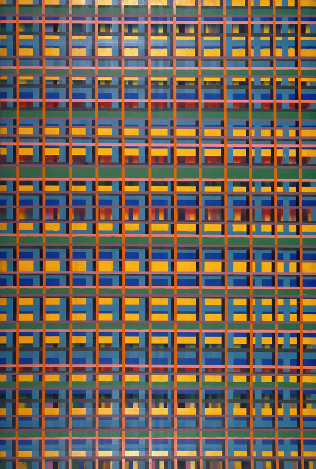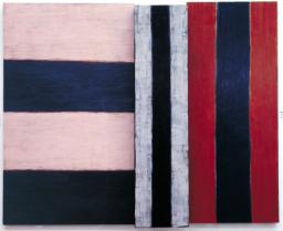 His diagonal strips, became horizontal and vertical lines, he then added stripped inserts, on the death of his son his work became dark, due to his severe back pain and having to stay in bed for a great length of time his work was only horizontal stripes. He found he could no longer paint verticals. Most recently his young son he has painted abstract images of but alongside this are still his horizontal lines.