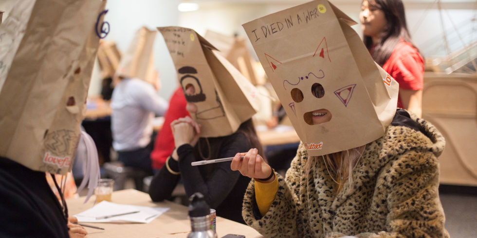 This made me think of a project I had done recently, where I used paper bags with a drawn on mouth, nose and eyes to portray emotions. I liked the idea of expanding upon this and making paper bag sculptures. The paper bag heads could even have projections of peoples faces on, while these people are talking about being scared, or happy etc. Or even have a little speaker in each of the heads again talking about specific emotions. The voice could talk about being scared, when the paper bag face is showing the expression of happiness. This contrast on expression and visual could be quite powerful?
