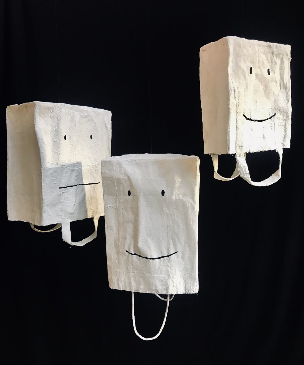 For my project, I got three different sized paper bags and using modrock, I covered the paper bags and their handles. Once they had set, I added an emoji looking eyes and mouth.